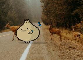 鹿さんが道を渡れるように一緒にわたるぽ